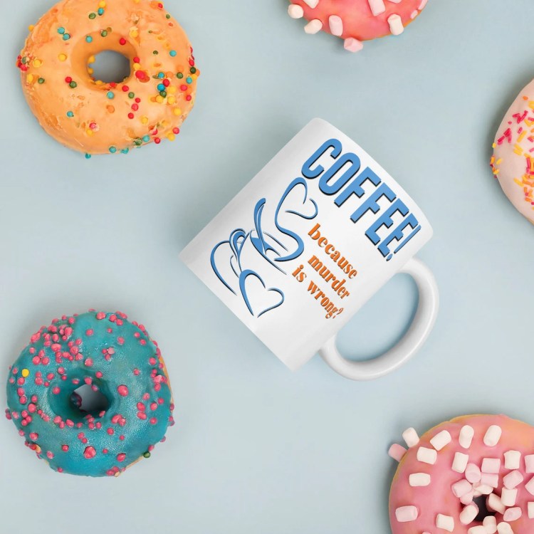Coffee! …because murder is wrong? On a white glossy mug. This design is specifically for lefties!