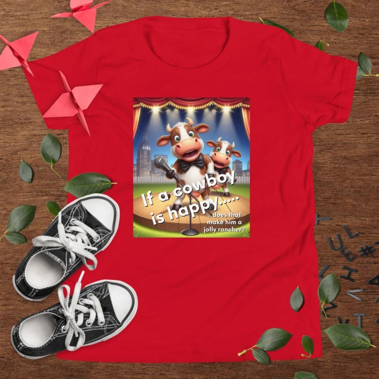 Funny Joke Short Sleeve T-Shirt for Youth: Cowboy, Jolly, Rancher, Cow, Comedy
